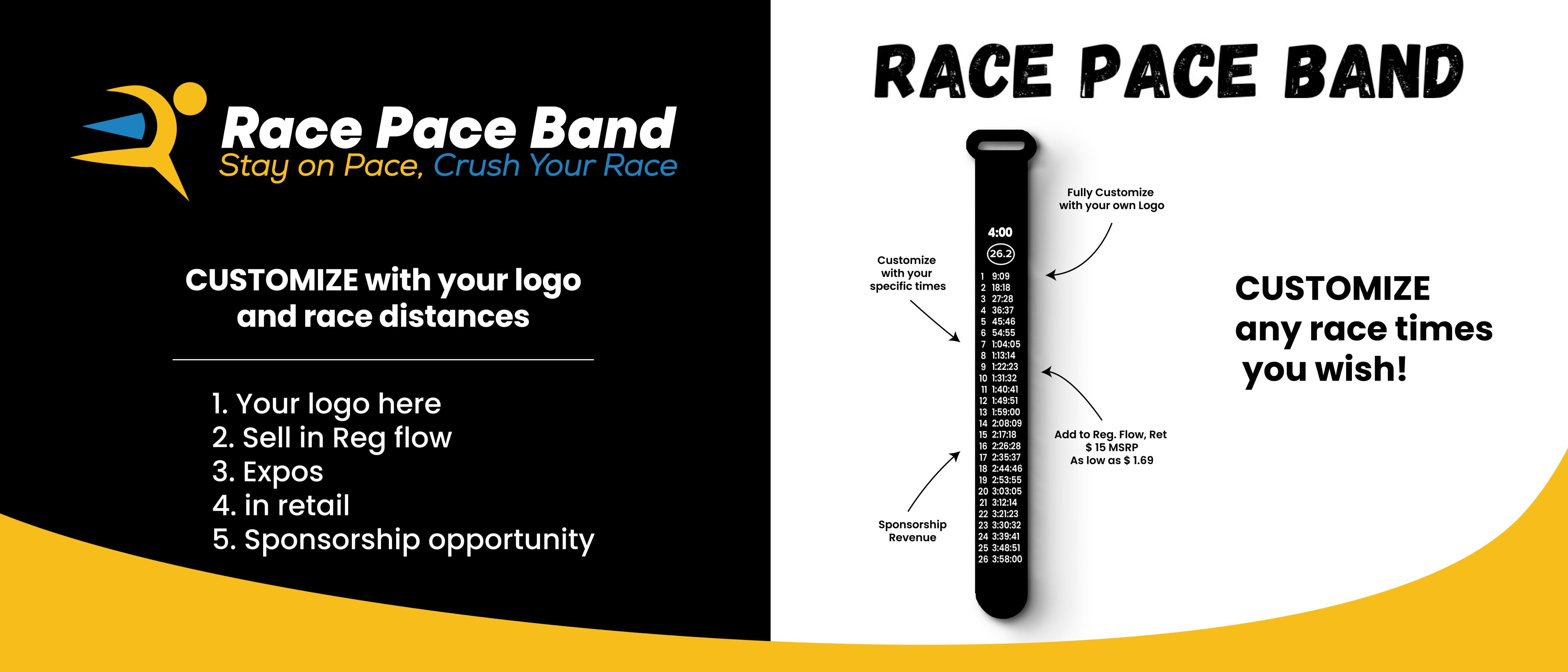 Customizable for Your Race: Offer athletes race-specific pace bands featuring custom times tailored to your course, providing a practical tool they'll love. Sell retail generate year round income.